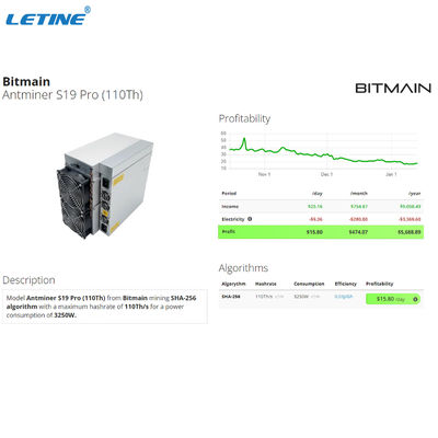 | Ant S19 Pro 110T | SHA-256 | 3250 W | 13.2KG | 195 x 290 x 370mm |
